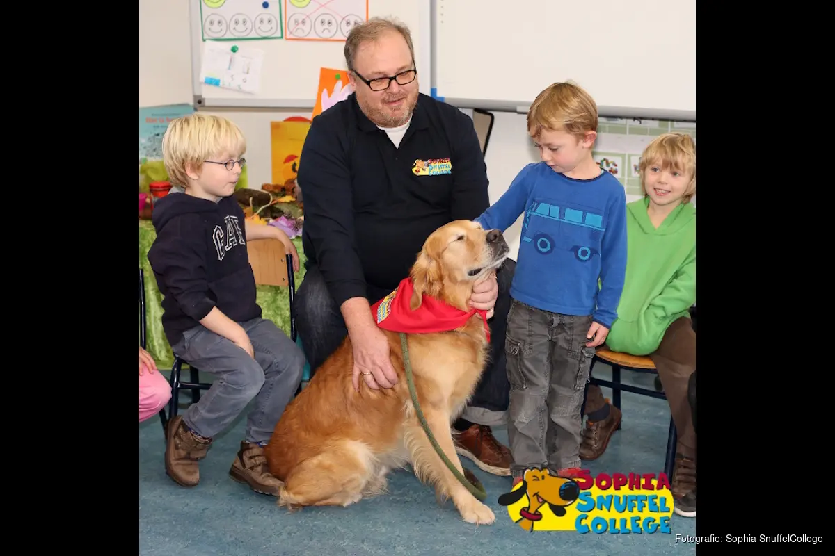 DRONTEN – Een veilige omgang tussen hond en kind. Dat is het doel van het Sophia SnuffelCollege, een scholenproject van de Koningin Sophia-Vereeniging tot Bescherming van Dieren. Dit project leert kinderen de dierentaal en draagt bij meer begrip en respect voor honden en andere dieren. Bovendien kan het aantal hondenbeten beperkt worden en neemt angst voor honden af. Op dinsdag 7 april is er een SnuffelVrijwilliger met zijn hond op bezoek bij groep 1 en 2 van Jenaplanschool de Klimboom.